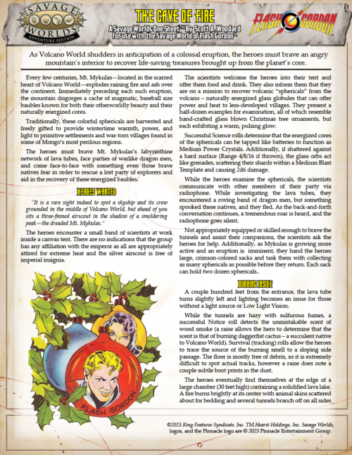 The Flash Gordon Roleplaying Game core rulebook contains detailed rules for hero creation, new races, Edges and Hindrances, gear, rocket ships, unique Setting Rules, gazetteer of the fantastic world of Mongo, a Plot Point campaign, Savage Tales, and a host of heroes, villains, and horrific beasts for the Game Master’s eyes only!